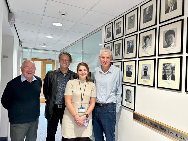 Alex gave the 27th Annual Dundee Cell Signaling Lecture at the University of Dundee, School of Life Sciences, November 14. Pictured are Prof. Sir Philip Cohen, Alex, Dr. Ralitsa Madsen and Prof. Dario Alessi.